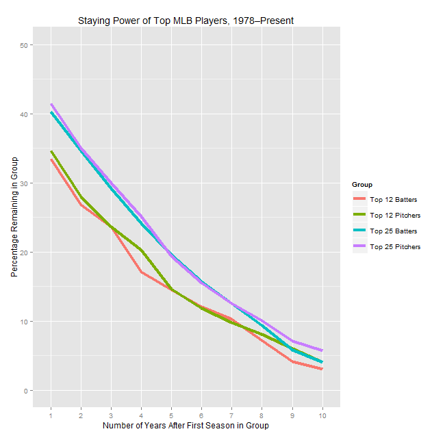As you can see, there’s a reasonable amount of volatility, in that the typical pitcher who cracks one of these lists won’t be on the same list the next year. While there’s a small difference between pitchers and position players for each group in the one year numbers, it’s not statistically significant and the lines blur together when looking at years further out, so I don’t think it’s meaningful.