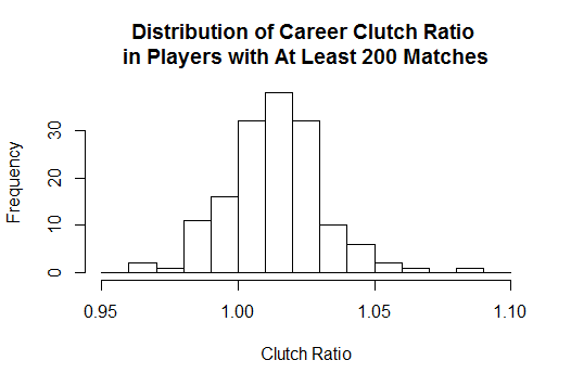 My data set consisted of career-level data split into 4th quarter/OT and 1st-3rd quarters, which I subset to only include carries occurring while the game was within 14 points (a cut popular with writers like Bill Barnwell—see about halfway down this post, for example) to attempt to remove huge blowouts, which may affect data integrity. My timeframe was 1999 to the present, which is when PFR has play-by-play data in its database. I then subset the list of running backs to only those with at least 50 carries in the first three quarters and in the fourth quarter and overtime (166 in all). (I looked at different carry cutoffs, and they don’t change any of my conclusions.)