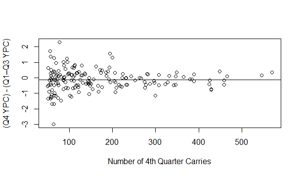 The second is that, beyond having to look at this potentially effect indirectly, we might actually have biases altering the perceived effect, as when a player runs ineffectively in the first part of the game, he will probably get fewer carries at the end—partially because he is probably running against a good defense, and partially because his team is likely to be behind and thus passing more. This means that it’s likely that more of the fourth quarter carries come when a runner is having a good day, possibly biasing our data.