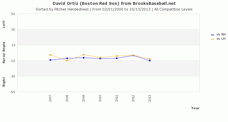 During the Tigers-Red Sox game last night, Tim McCarver said he thought it was a little odd that the Tigers would bring in lefty Drew Smyly to face David Ortiz while also leaving the shift on, since lefties are more likely to go to the opposite field against a left-handed pitcher. (At the very least, I know he said this last part. Memory is a tricky thing, and I’m now not sure whether he said this about Ortiz or someone else, possibly Alex Avila.) Being Tim McCarver, he didn’t say why this might be true, nor did he cite a source for this information, putting this firmly in the realm of obnoxious hypotheses.