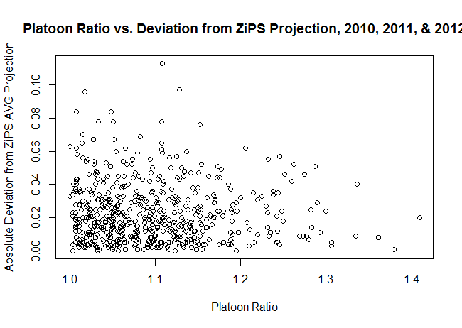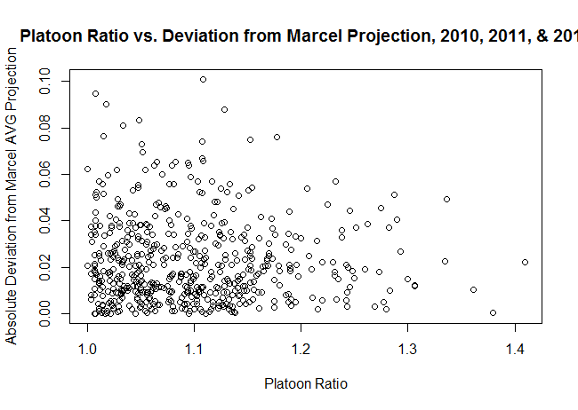 I computed that severity for players with at least 500 PA against both left-handers and right-handers going into the season for which they were projected; for instance, for 2010 I would have used career data stopping at 2009. I then looked at their actual BA in the projected year, computed the deviation between that BA and the projected BA, and saw if there was any correlation between the deviation and the platoon ratio. (I actually used the absolute value of the deviation, so that magnitude was taken into account without worrying about direction.) Taking into account the availability of projections and requiring that players have at least 150 PA in the season where the deviation is measured, we have a sample size of 556 player seasons.