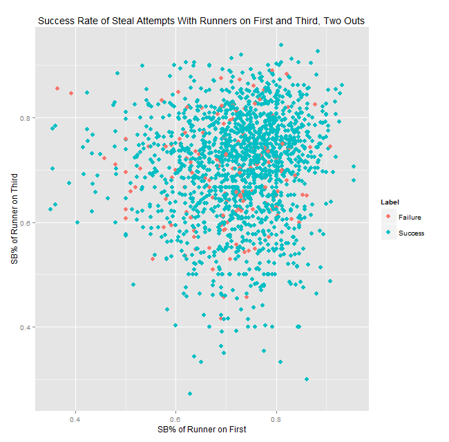 Next, there were some questions about how much of the success rate is due to having abnormally good or bad runners. Here are two plots showing all successes and failures by the stolen base percentages of the runners on first and third. The first is for all situations, the second for two out situations only.